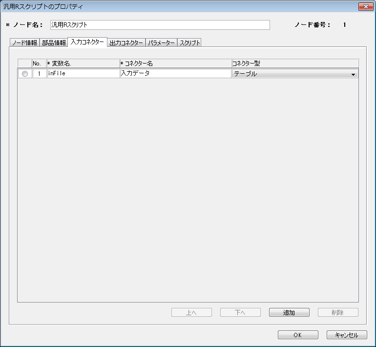 汎用コマンド部品、汎用Rスクリプト部品の場合は「テーブル」または「全ノード接続可能型」のどちらか、汎用SQL部品の場合は「テーブル」を選択してください。