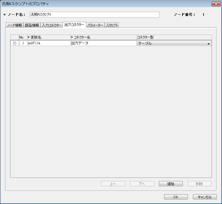 汎用コマンド部品、汎用Rスクリプト部品の場合は「テーブル」または「全ノード接続可能型」のどちらか、汎用SQL部品の場合は「テーブル」を選択してください。
