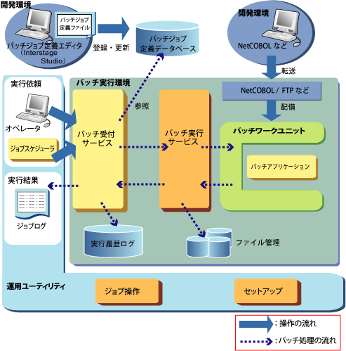 Interstage Job Workload Serverの実行制御プログラムです。バッチ実行環境は、“バッチ受付サービス”、“バッチ実行サービス”および“バッチワークユニット”で構成しています。