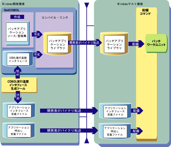 バッチサーバでバッチアプリケーションを開発します。バッチアプリケーションおよびWindows(R)開発環境で生成した各種定義ファイルをバッチワークユニットに配備します。