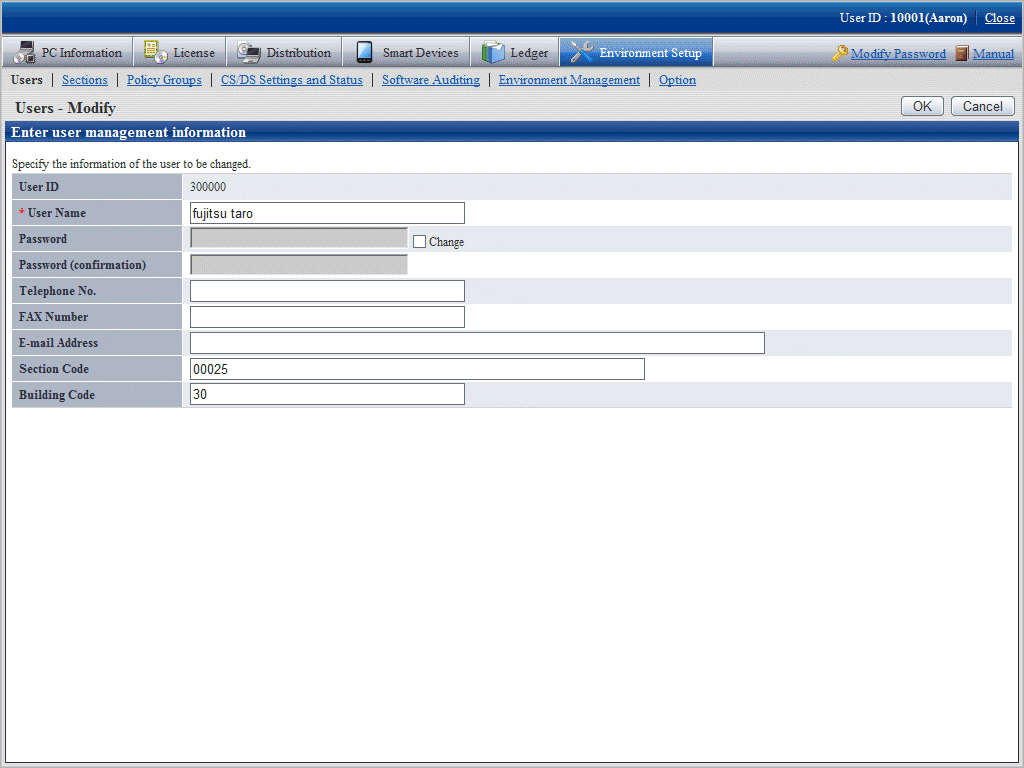 Section Code | Specify the section code of the section to which the user belongs. Use up to 36 halfwidth alphanumeric characters and the halfwidth symbol "-". If the section code contains alphabetic characters, use uppercase characters. A code specified in lowercase alphabetic characters will be registered in uppercase characters. |