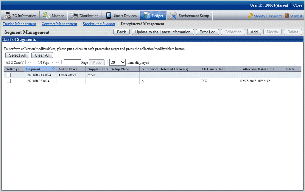Select Segment | Display the network segment list in the form of tree (display in the descending order of number of unregistered device). Take the whole company as the root directory and display the network segment under which the unregistered device exist in the following format (not display the network segment where unregistered device do not exist). The setting location of network segment (supplement for setting location) [Number of Unregistered Device: n] The setting location: setting location name set in the network segment Display IP address when the setting location has not be set. Supplement for setting location: the setting location set in the supplemented network segment n: detected number of unregistered device By selecting the network segment, display the list of network segment subordinate unregistered device. When the whole company is selected, the list of all registered device will be displayed. |