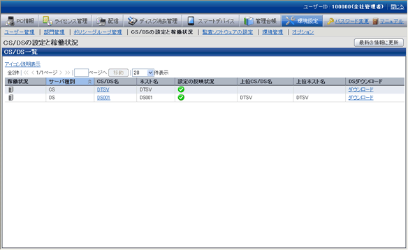 メインメニューが表示されますので、[環境設定]画面の[CS/DSの設定と稼働状況]をクリックすると、以下の画面が表示されます。