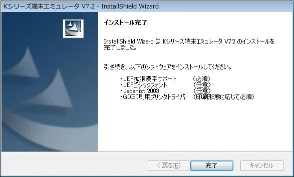 インストールが完了すると、本製品を利用するためのアイコン(ショートカット)が集まった、「Kシリーズ端末エミュレータフォルダ」(次項)が作成されます。