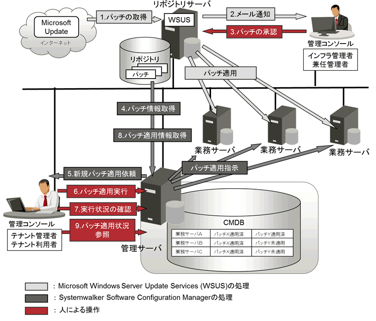 Systemwalker Software Configuration ManagerがWSUSからパッチ適用情報を取り出してCMDBに格納します。