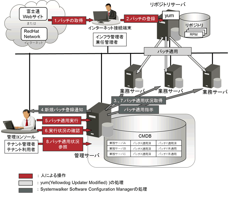 インフラ管理者はインターネット接続端末を使用して富士通WebサイトまたはRed Hat Networkより、最新のパッチ(RPM)を取得します。
