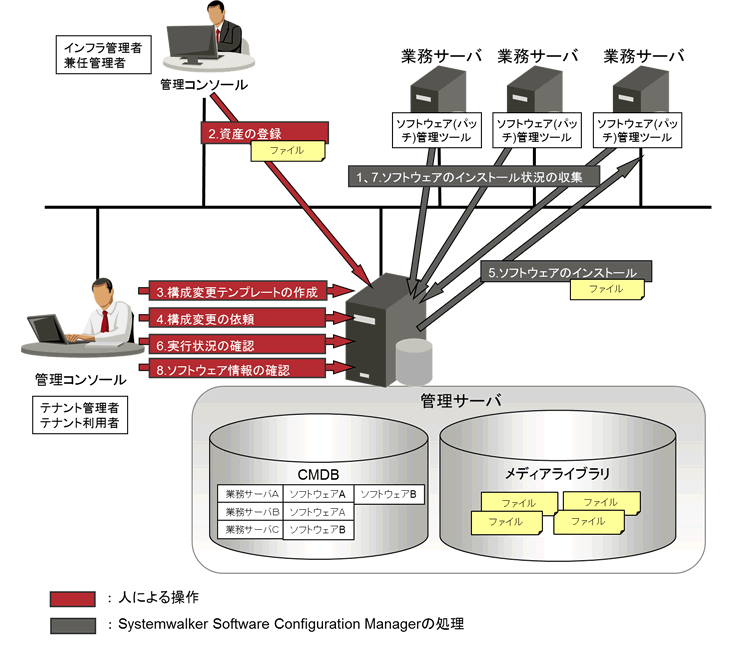 Systemwalker Software Configuration Managerは、構成変更テンプレートで定義された処理にしたがって、管理対象サーバに対してソフトウェアのインストールを行います。