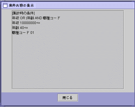 「条件内容の表示」ダイアログボックスに指定している条件内容を、表示することができます。表示される条件内容は、以下のとおりです。