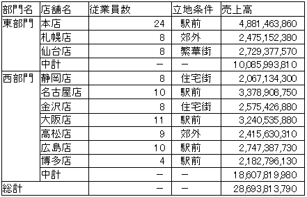 以下の例は、店舗マスタにある「従業員数」と「立地条件」を店舗名の付帯情報とした問い合わせ表です。