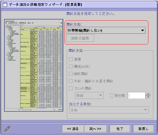 付帯情報の指定は、「データ項目の詳細指定ウィザード」画面で行います。[集計方法]から「付帯情報(集計しない)」を選択します。