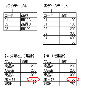 たとえば、以下のようなマスタテーブルで結合されている実データテーブルにおいて、実データテーブル内の結合キーがNULL値のデータだけを未分類として扱うことが可能になります。