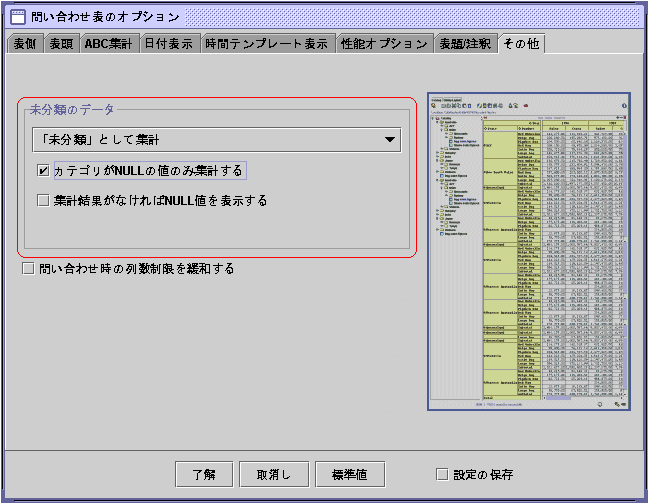 未分類指定におけるNULL値だけの集計の指定は、「問い合わせ表オプション」画面で行います。