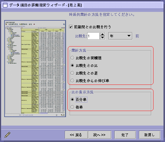 前期間との比較を行う指定は、「データ項目の詳細指定ウィザード」画面で行います。前期間との比較を行う項目に対して、比較対象となる時期や比の表示方法を選択します。