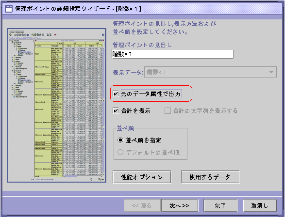 表側に設定した管理ポイントが全値型の場合、管理ポイントの作成元のデータ属性で出力するように指定することができます。[管理ポイントの詳細指定]ウィザードを開き、[元のデータ属性で出力]チェックボックスにチェックします。