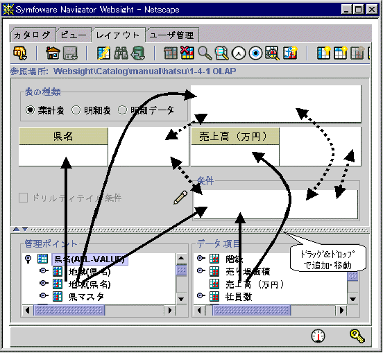 [レイアウトタブ]で、マウスのドラッグ&ドロップ操作による、管理ポイント、またはデータ項目の追加と移動ができるようになりました。