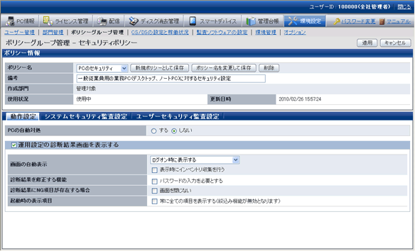 監査するセキュリティの設定項目を、メインメニューの[環境設定]-[ポリシーグループ管理]で設定します。