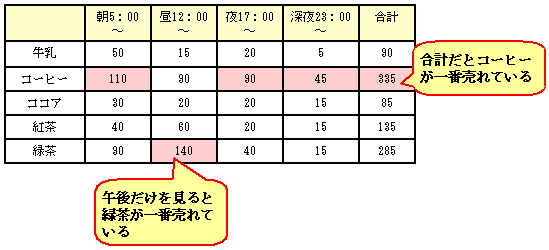 商品別に調べると、コーヒーが一番売れていますが、昼に限っては、緑茶が売れていることがわかり、商品棚の配置を昼だけ、緑茶中心に変えるなどの対策を考えることができます。