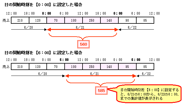 従来では、日の開始時刻は、「0:00」でしかなく、例えば、深夜帯におよぶような営業時間の場合、0:00を境に、売上集計が2分割されてしまいます。このような場合に、日の開始時刻を設定することで、営業時間に合わせた集計結果を得ることができます。