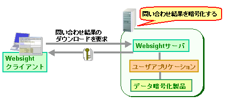 Websightサーバとデータ暗号化製品と組み合わせたシステムを構築できます。データ暗号化製品と連携すると、問い合わせ結果の暗号化が可能となり、ウィルスによる情報漏洩などへの対策強化を図ることができます。