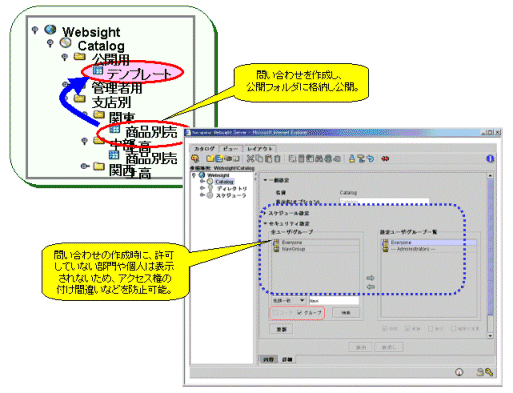 Websightでは、問い合わせの手順や問い合わせ結果をカタログ資源として管理し、一般利用者がこれを共有できます。カタログ資源にはアクセス権限を設定しておくことで、許可しない部門や個人に対して表示やアクセスを禁止できます。V7.0L10では、一般利用者が行うアクセス権限の設定をシステム部門が限定することができます。これにより、情報共有における安全性が高まります。