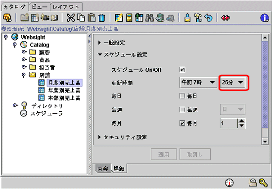 カタログタブの“スケジュール設定”で、フォルダまたは問い合わせごとにスケジュール時刻を時間と分で設定します。