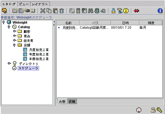 Websight管理者は設定したスケジュールの一覧をカタログタブのスケジューラで確認することができます。