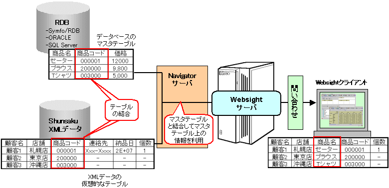 また、Shunsakuと連携したXMLデータの問い合わせでは、ShunsakuのXMLデータだけの問い合わせはもちろん、他のリレーショナルデータベース上に存在するマスタテーブルとShunsakuのXMLデータを結合した問い合わせをすることができます。