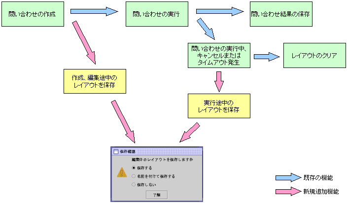 作成または編集中の問い合わせを、実行する前にレイアウトを保存できる機能です。また、レイアウト実行中にキャンセルを行なった場合や、タイムアウトが発生した場合でも、実行途中のレイアウトを保存できます。