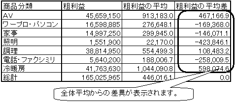 カテゴリごとに、中計や総計との差を表示することができます。以下の例は、「商品分類」ごとの平均と、粗利益全体での平均との差を表示する場合の帳票です。