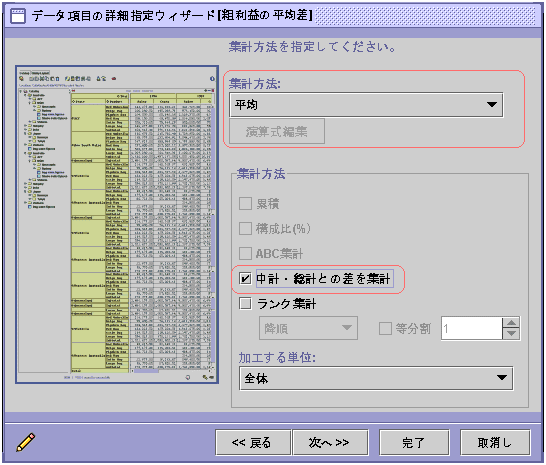 中計や総計との差の指定は、「データ項目の詳細指定ウィザード」画面で行います。[集計方法]に「平均」を指定し、[中計・総計との差を集計]のチェックボックスをチェックします。