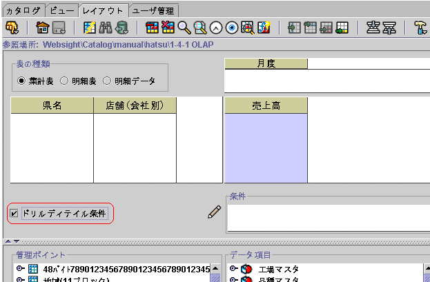 ドリルディテイルによって生成された条件を、使用するかどうかを指定することができます。ドリルディテイルで作成された明細表を[レイアウトタブ]で表示した時に、[ドリルディテイル条件]チェックボックスがチェックされている場合に操作ができます。この機能が使用できるのは、保存されている明細表を編集する時だけです。