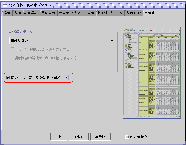 問い合わせ時の列数制限の緩和の指定は、問い合わせ表のオプションより行います。[その他タブ]より、[問い合わせ時の列数制限を緩和する]チェックボックスをチェックします。