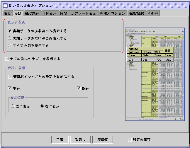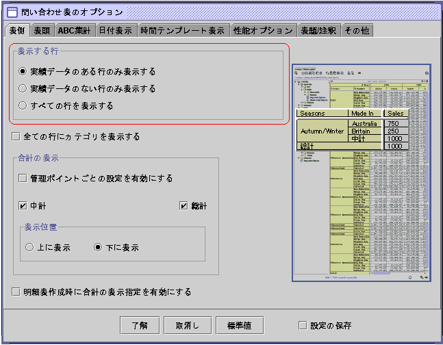 実績データのない行/列だけ表示する指定は、「問い合わせ表のオプション」ダイアログボックスの[表頭タブ]、および[表側タブ]で行います。