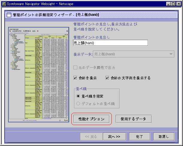 性能オプションは、「管理ポイントの詳細指定ウィザード」画面の[性能オプション]ボタンのクリックにより表示される、「性能オプションの設定」ダイアログで指定します。
