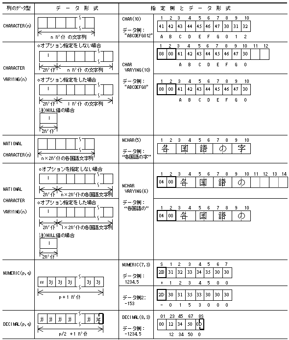 列のデータ型と外部ファイルのデータの記述形式の対応を以下に示します。