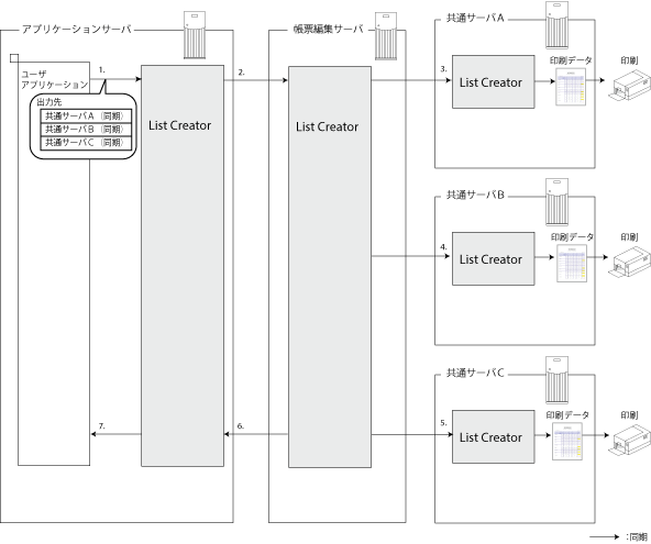 帳票編集サーバ上のList Creatorは、指定された共通サーバCに対して帳票の印刷を実行します。