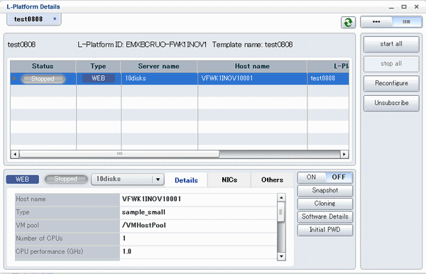 [Start all] button: Turns the power on for all servers in the L-Platform as a group.