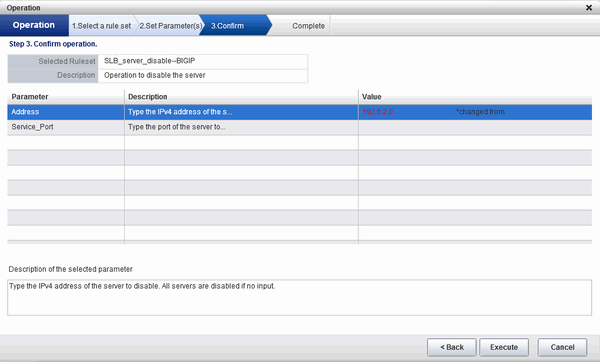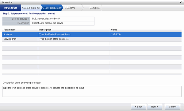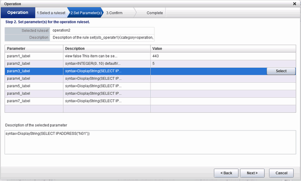 Specify the parameters for operation corresponding to the ruleset in the [Set Parameter(s)] page. No information for parameters is displayed if there are no parameters.