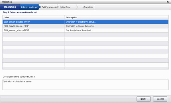 The rulesets for operating the target server load balancer are displayed in the [Select a ruleset] page. In the ruleset description section in the lower part of the window, the description of the ruleset in the row being pointed at is displayed.