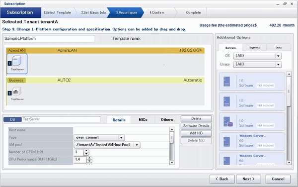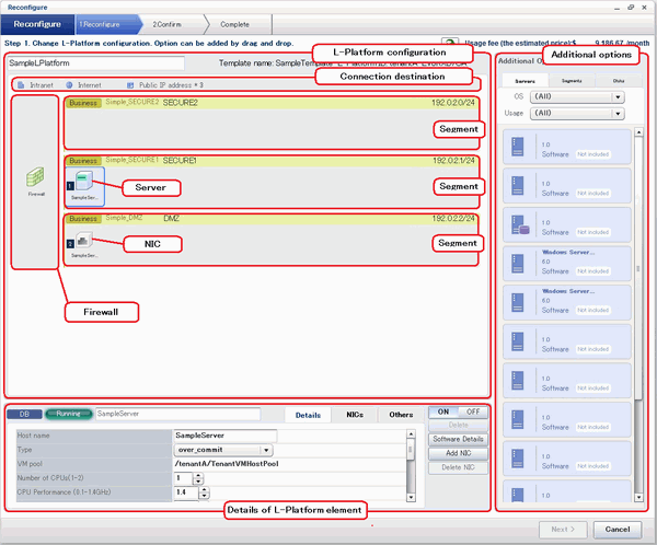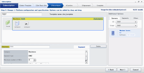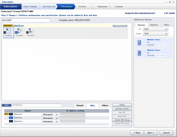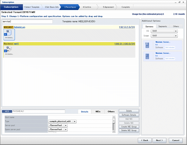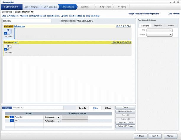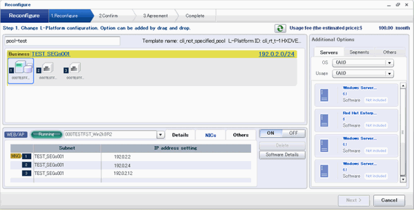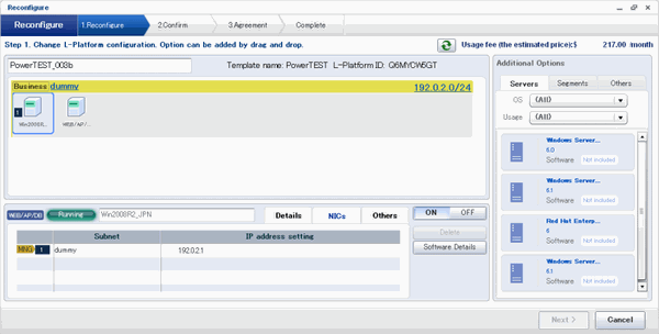 The following window displays an example of the [Reconfigure] page when a segment name is clicked. The following window shows the [Reconfigure] page used to subscribe to an L-Platform.