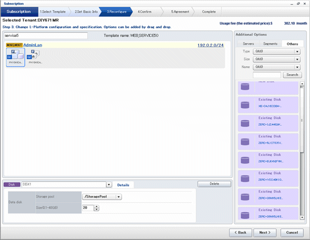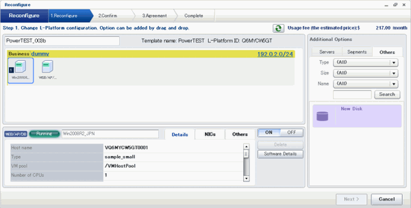 The following example displays the [Reconfigure] page when a disk is selected. The following window shows the [Reconfigure] page used to subscribe to an L-Platform.