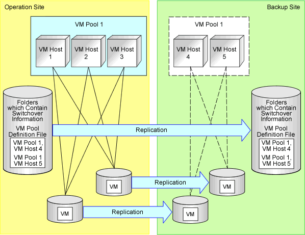 It is possible to use a VM pool definition file to reduce the number of VM hosts on the switchover destination site. Refer to "Figure 2.4 Settings to Reduce the Number of VM Hosts on a Switchover Destination Site". For details on configuration, refer to "4. Create a VM pool definition file [Virtual L-Server switchover (VM guest)]" in "3.6 Creating Files Used for Switchover".