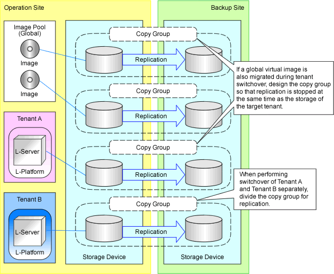 Configure the control item (copy group) for storage replication for each tenant being switched over simultaneously. Refer to "Figure 2.7 Configuring Copy Groups".