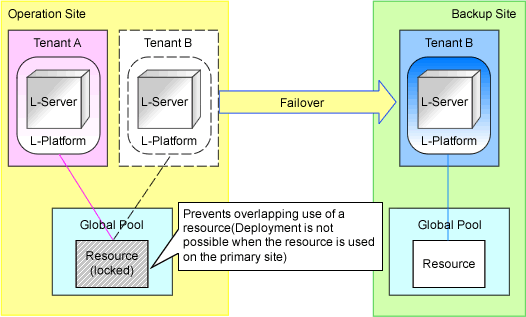 Before tenant switchover, lock the resources used by the target tenants to be switched over in the switchover source site. Locking resources prevents the overlapping use of the resource in multiple sites. Refer to "Figure 2.8 Locking Resources". For details on how to lock and unlock resources, refer to "4.2 Switchover between Sites Using the Disaster Recovery Function".