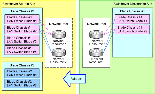 During failback, network resources are recovered in the switchover destination site according to the settings of network resources in the switchover source site. Refer to "Figure 2.13 Failback by a Configuration that Reduces the Number of Blade Chassis and LAN Switch Blades in the Switchover Destination Site".