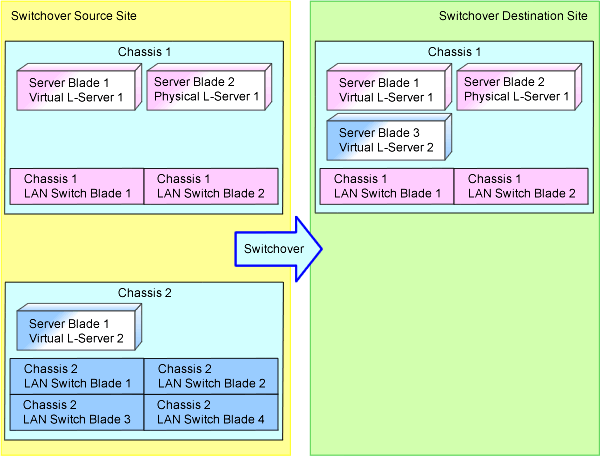 Figure 2.12 Failover by a Configuration that Reduces the Number of Blade Chassis and LAN Switch Blades in the Switchover Destination Site