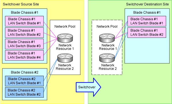 The network resources using ports of LAN switch blades to be degraded as external connection ports are created as an internal network of the switchover destination site. Refer to "Figure 2.12 Failover by a Configuration that Reduces the Number of Blade Chassis and LAN Switch Blades in the Switchover Destination Site".