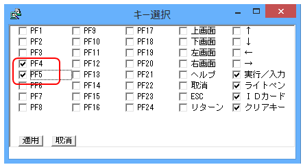 キー選択の設定画面で、「PF4」と「PF5」をチェックします。