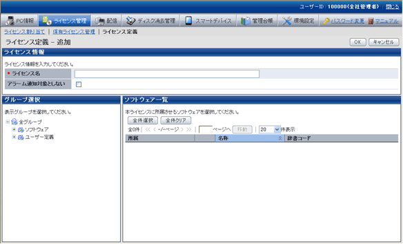 部門管理アカウントのユーザーIDでログインした場合は、[ライセンス定義]のリンクは表示されません。