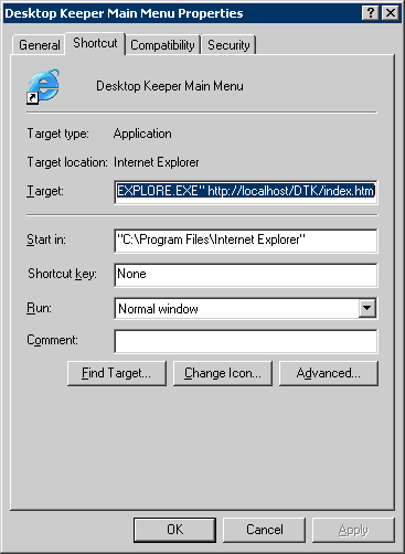 Modify the port number on the URL displayed at Target of the Properties of Desktop Keeper Main Menu window to make it consistent with the modified port number.